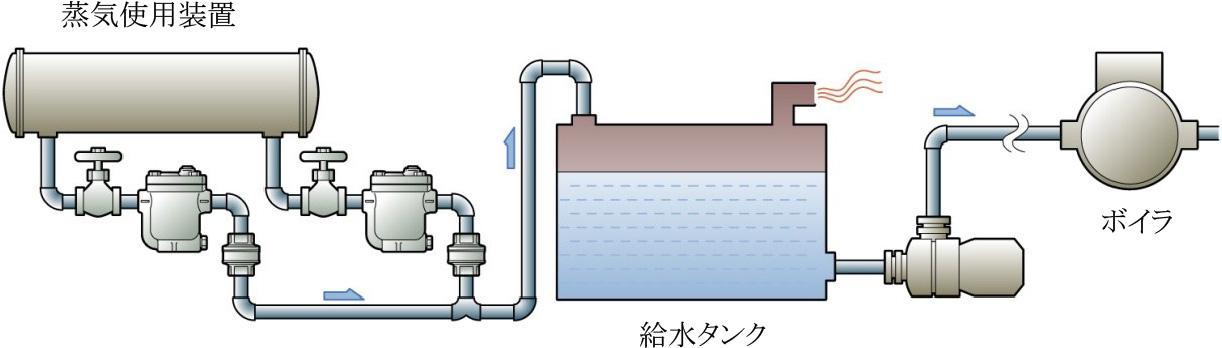 スチームトラップを介して、その一次側圧力により復水を給水タンクへ圧送しています。