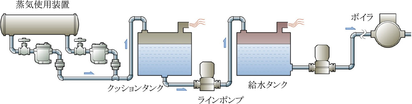 スチームトラップの一次側圧力だけでは給水タンクまで圧送できない場合はラインポンプで中継します。そのため、復水を一旦溜め置くクッションタンクを設置しています。