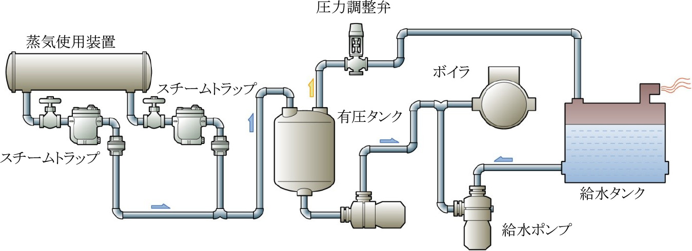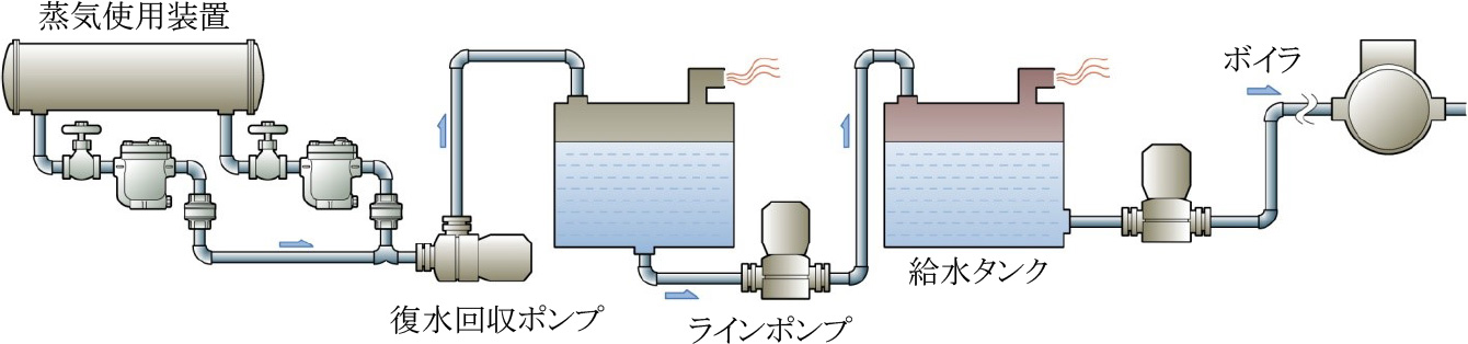 スチームトラップからの圧力が低い場合は、復水回収ポンプを用いて、引込力を確保する必要があります。