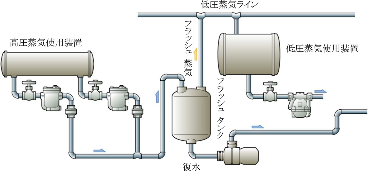 回収復水をフラッシュタンクに導いて再蒸発させ、そのフラッシュ蒸気を低圧ラインへ導いて再利用しています。蒸発しなかった復水は他の用途のために更に回収されます。