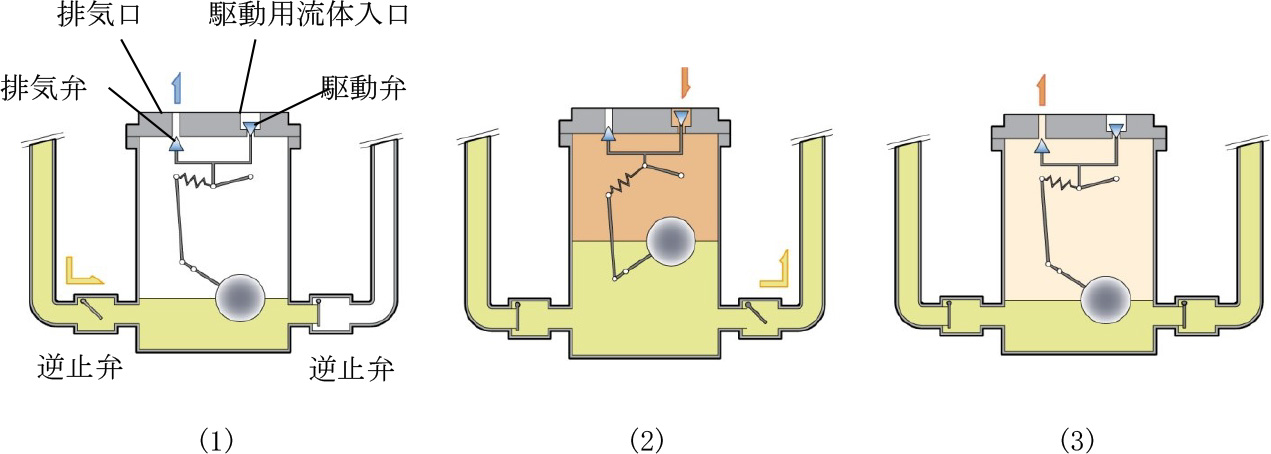 (3) 復水が押し出されて本体内の水位が下がり、フロートが所定の位置まで下 降すると、再び切換機構が働いて駆動弁が閉じ、排気弁が開きます。駆動用 流体が排気弁から排気されるに伴い本体内の圧力も低下します「均圧工程」。