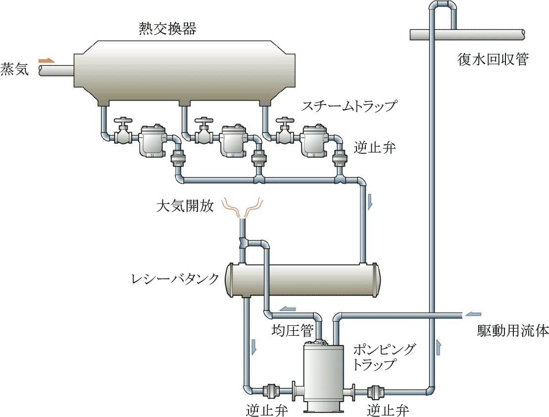 図 5.9 は、ポンピングトラップの基本的な設置構成を示しています。熱交換器等 の蒸気使用機器で発生した復水は、スチームトラップを通して一旦レシーバタン クへ導かれます。レシーバタンクはポンピングトラップの上方に位置するため、 流入工程ではその水頭圧によって復水がポンピングトラップ本体へ流れ込みます。昇圧工程では駆動用流体がポンピングトラップ内へ流入しますが、この流体は蒸 気の他、空気や窒素ガスも使用されます。均圧工程で排気される流体は、均圧管 を通してレシーバタンクへ導かれています。これによって、ポンピングトラップ 本体の圧力がレシーバタンクとほぼ同圧まで減圧されます。入口部と出口部の逆 止弁、均圧管、及びレシーバタンクは不可欠な構成要素です。㈱ミヤワキは、単 品モデルの他、これらの構成要素を組み込んだパッケージモデルも提供していま す。