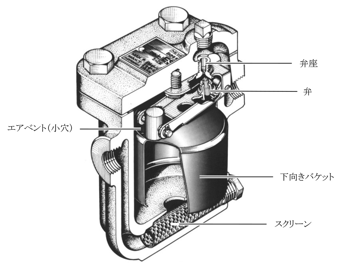 再び復水が流入すると、バケット内の蒸気はエアベントからバケット外へ流出して復水との置換が生じます。バケットは浮力を失って沈み、それによって再び開弁します。以後、同様な開閉弁を繰り返します。