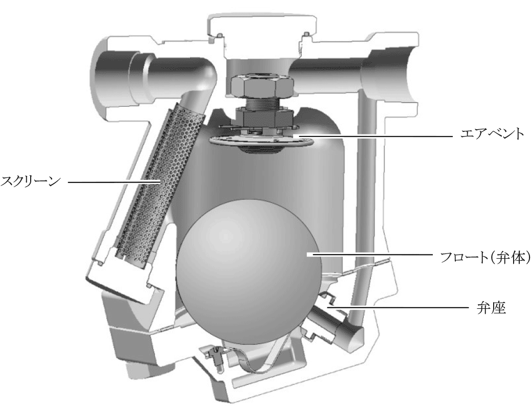図 2.5 に示すのは、レバーフリー型のフロートトラップです。レバー付フロートトラップとの違いは、フロート球が同時に弁として機能する点です。作動の仕方については、レバー付フロートトラップと同様のため割愛します。