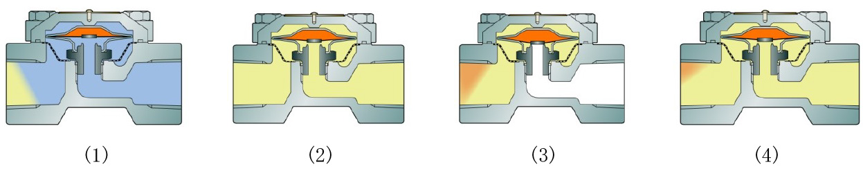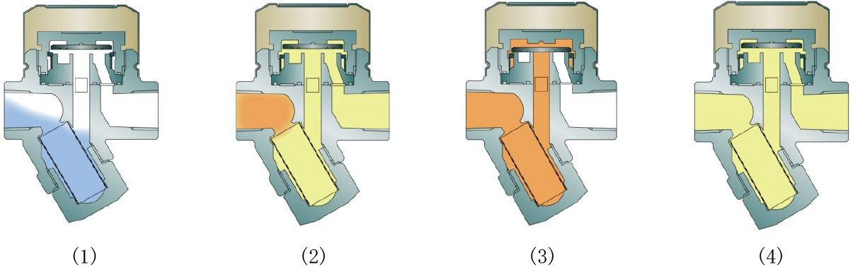 再び復水が流入しても変圧室の蒸気が放熱によって凝縮するまでは閉弁を維持しますが、やがて凝縮してその圧力が下がり、ディスク下側の圧力がその上側の圧力に打ち勝って開弁します。
