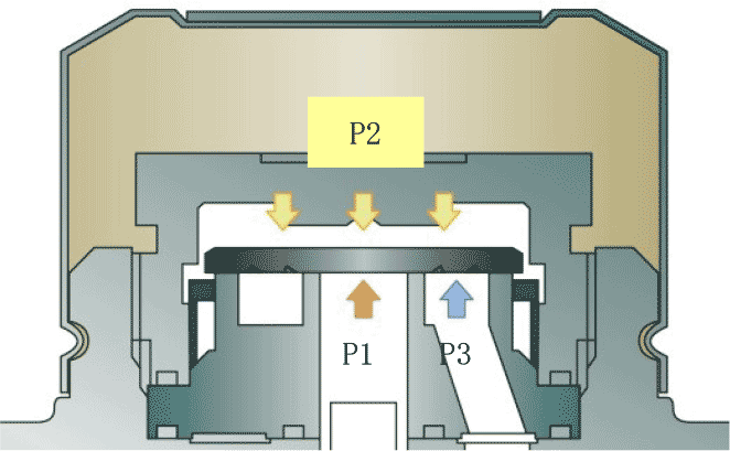 図 2.13 より、開弁力には一次側圧力と二次側圧力が寄与し、その力の大きさは各々P1×A1、P3×A3 です。一方閉弁力に寄与するのは変圧室の圧力で、その大きさは P2×A2 です。