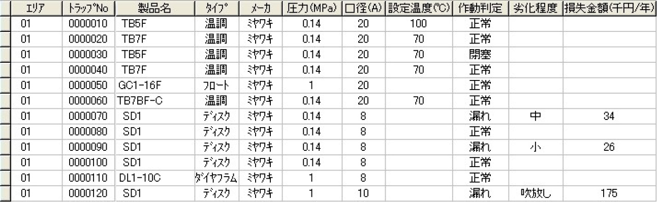 このように PM301 は、個々のトラップの診断から、診断結果の記録、及び蒸気漏れ量や蒸気損失の算出を含め、集計分析処理まで全て自動で行うツールです。 管理台帳は、専用ソフトウエア(PM330)で作成しますが、必須登録事項はすでに固定項目として用意されています。それに加えてユーザが自由に選んで使用できる選択項目もあります。