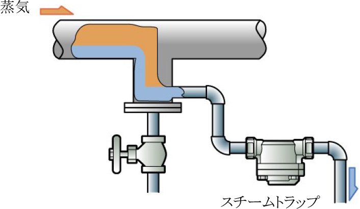 後述する装置等の例とは異なり、高速蒸気に引かれて移動している復水をその中途で捕獲しなければならないため、完全除去は困難です。蒸気主管で発生する復水は、多くの場合少量であり、それに対応して復水排出管も口径の小さいものが使われます。このため、復水排出管を蒸気主管に接続するところには、捕獲効率を高める手段として図 4.1 に示すような復水集合ポケットを設ける方法があります。