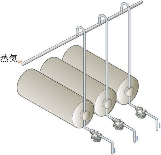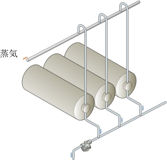 このように、グループトラッピングは、復水の円滑な排出を妨げ、装置性能に悪影響を及ぼします。スチームトラップの数量が少なくて済む構成ですが、明らかにスチームトラッピングに対する認識不足によるものです。個別トラッピングの妥当性を改めて理解することが大切です。