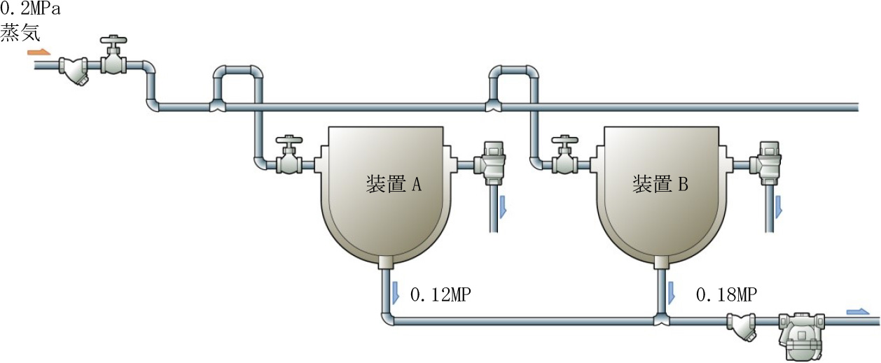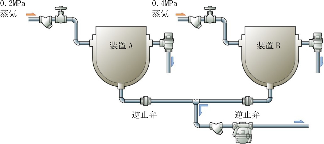 図 4.5 は、互いに同じ圧力で使用される装置の場合です。装置 B は通常運転状態で、その内部も所定温度に達しているものとします。この状態で装置 A の運転を開始すると、その中が冷えているために装置 B よりずっと多くの復水が発生します。蒸気が多く凝縮するために圧力が下がり、それによって装置 B から蒸気の流れ込みが生じます。装置 A はこの蒸気に抗して復水排出しなければならないことになります。