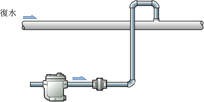 スチームトラップの復水排出管を共通復水管へ導くときは、その共通復水管の底部ではなく、頂部へ接続するようにします(図 4.10)。これは特に立上げ配管の場合に注意すべきことで、共通復水管の復水流れを円滑に維持すると共に、共通復水管の復水がスチームトラップ出口部まで流下するのを回避するためです。スチームトラップ出口部には逆止弁を取付けるようにします。