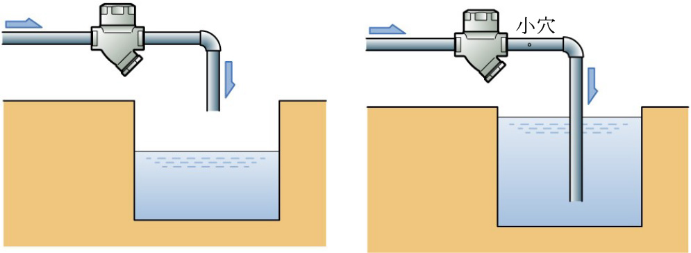雨天時などに増水して水没する可能性がある場合は、排出管に小穴を設けておくのが賢明です(図 4.11 の右図)。