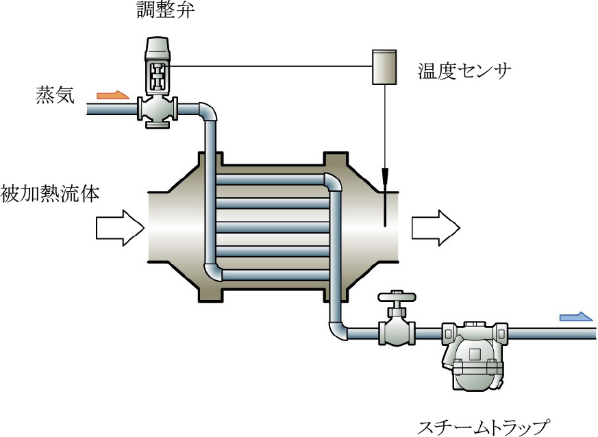 ここに、圧力変動による不具合例として、温度調整弁を用いた熱交換器の運転について説明します。図 3.7 において、調整弁は、熱交換器で加熱された被加熱物の出口温度に応じてその開度を調節し、それによって供給蒸気量を調節して出口温度を一定に保つように作動します。